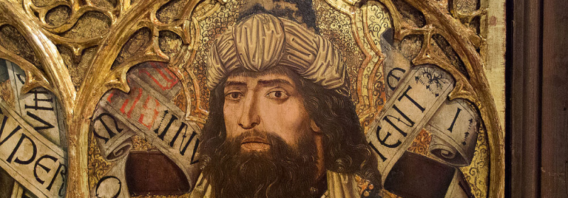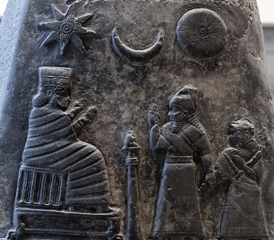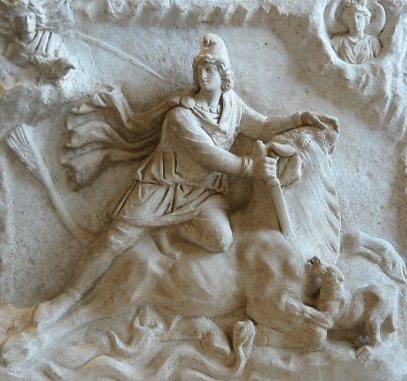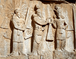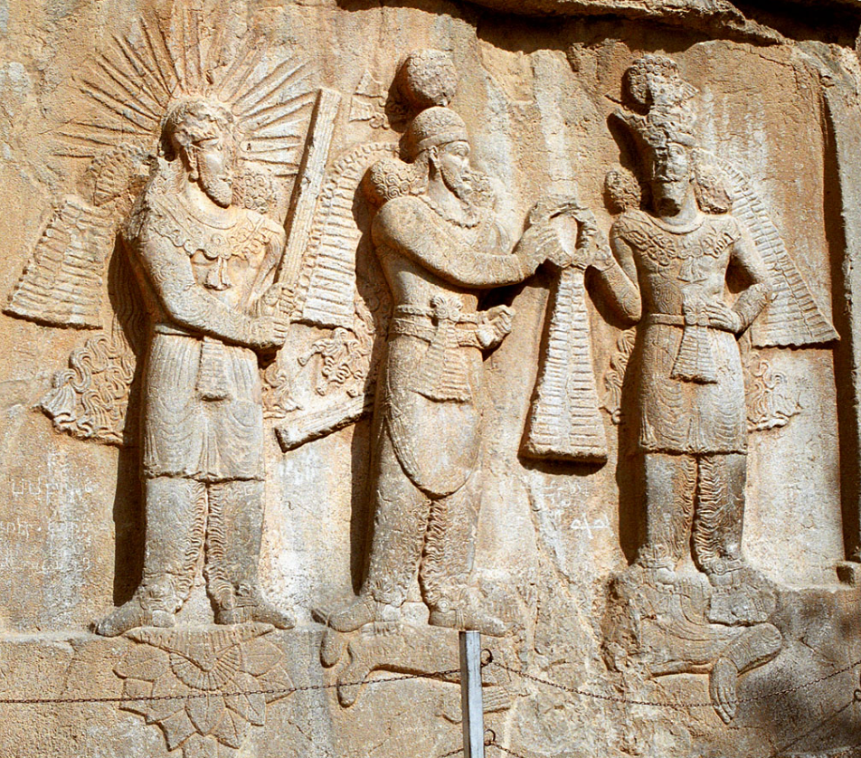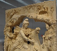 The Persian god Mithra on the left, with beams of light like the Sun emanating from his head in all directions