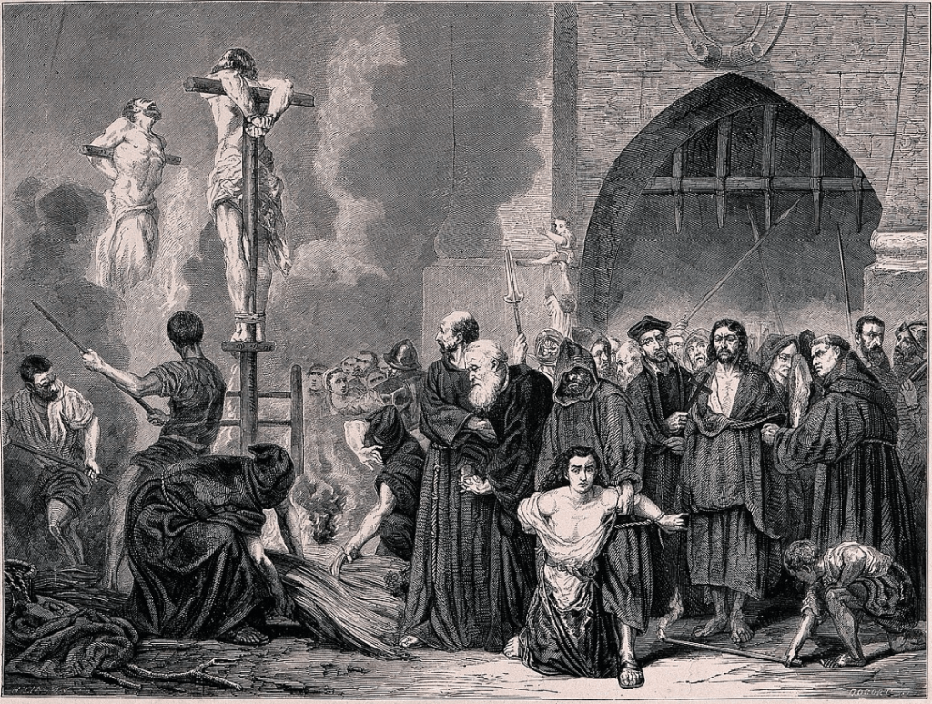 — then the Spanish Inquisition: under Papal control, King Ferdinand and Queen Isabella in the 1480-1590s have around 150,000 Jews prosecuted for various offences. 3,000–5,000 were executed, particularly in the initial 50 years, mostly by burning at the stake. Others included penance and public flogging, exile, enslavement on galleys, and prison terms from years to life, together with the confiscation of all property: Wikipedia