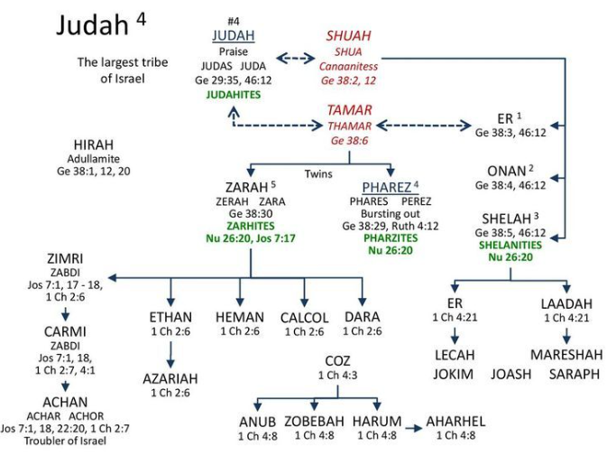 28 And it came to pass, when she travailed, that the one put out his hand; and the midwife took and bound upon his hand a scarlet thread, saying, “This came out first.” — Tamar bears Perez and Zerah to Judah; but a breach be upon them, or be imputed to them;