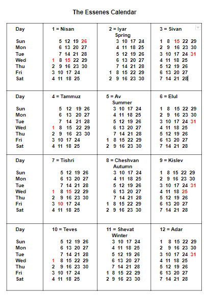 A. calendar; “the Essene/Qumran calendar has their own 364 day solar calendar at odds with the calendrics of the Sanhedrin”. The Essene sacred year always began on the vernal (spring) equinox and is, by definition, Wednesday (because God Created the “lights in the firmament” for “signs and seasons” on the 4th Day), 1st day of the 1st month (Nisan or Abib). Consequently, the Essene Passover will always begin at 6 PM Tuesday, 13 days later (Nisan 14). The key point being Essene Passover always began “Tuesday” evening, 13 days after the vernal equinox. To outsiders, the Essenes would appear to observe the vernal equinox and (regardless of whatever the previous day was) declare that day to be Wednesday 1 Nisan.