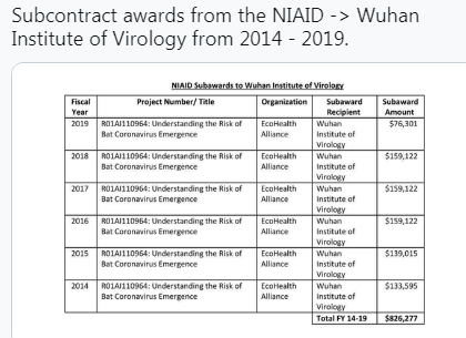 That appears to be technically true, as the NIH grants actually go to a New York-based nonprofit EcoHealth Alliance (where Dr Peter Daszak is President, later a member of the WHO team sent to investigate the origins of the virus in China) – which then subcontracts some of its work to the Wuhan Institute of Virology.