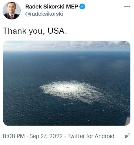 In addressing the ‘mystery’ sabotage incidents, Blinken began, “I think first it’s important to make clear that these pipelines – that is, Nord Stream 1 and Nord Stream 2 – were not pumping gas into Europe at this time. Nord Stream 2 never became operational, as is well known. Nord Stream 1 has been shut down for weeks because of Russia’s weaponization of energy.”