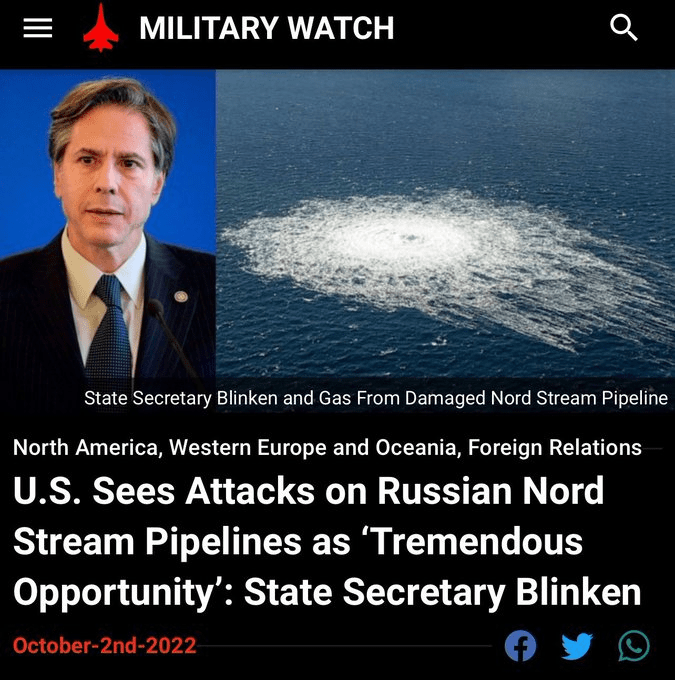 Blinken Calls Sabotage Attacks On Nord Stream Pipelines A “Tremendous Opportunity”