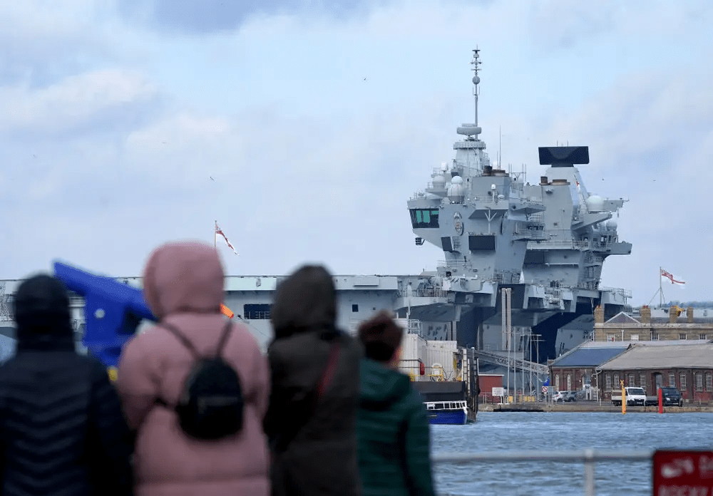 The UK Ministry of Defence did not give a reason for the delayed departure, saying in a statement that the aircraft carrier was “due to sail from Portsmouth soon, subject to suitable tide and weather conditions.