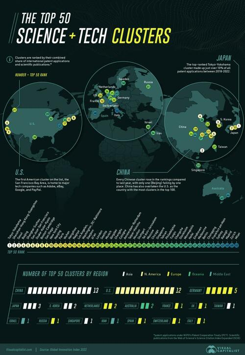 This map, via Visual Capitalist’s Niccolo Conte, explores the world’s top 50 science and technology hubs leading these innovations based on data from the Global Innovation Index 2023. Hubs were ranked by their combined share of international patent applications and scientific publications.