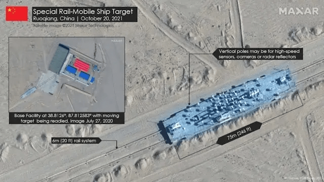 Satellite images taken in October 2021 by US space tech company Maxar Technologies show a newly constructed test range in the Taklamakan Desert in southwestern Xinjiang. The range features full-scale models of US Navy ships, possibly used for training, including one aircraft carrier and at least two Arleigh Burke-class destroyers—both used by the US Seventh Fleet in transits through the Taiwan Strait.