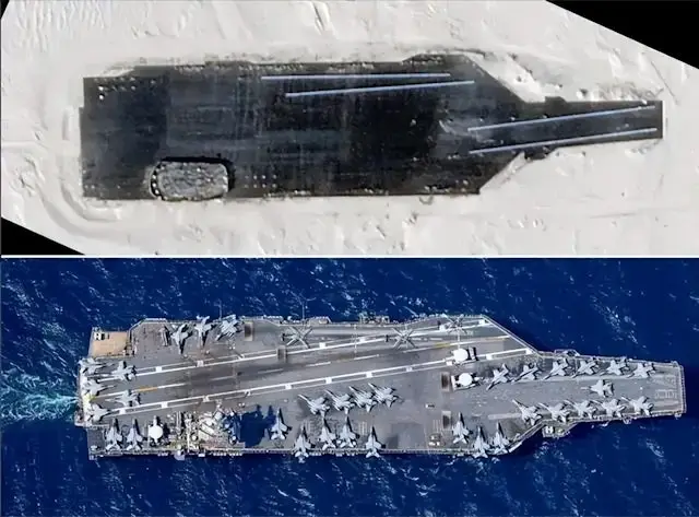 A satellite image taken by US commercial satellite firm Planet Labs on January 1, 2023, shows the PLA constructed a new mock-up in the Taklamakan Desert starting in November 2023 that fully imitates the US Navy’s latest aircraft carrier, the USS Gerald R Ford.
