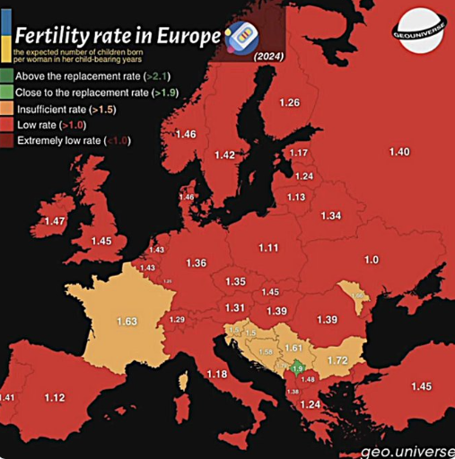 According to the UK’s Office for National Statistics, the fertility rate in England and Wales fell to 1.4 in 2024, while Scotland’s stood at 1.3 – both far below replacement levels. In the EU, fertility has been declining for years, reaching a record low of 1.4 live births per woman in 2023.