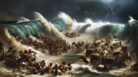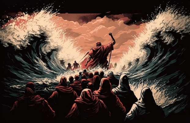 “And immediately, the Lord drove the sea with a powerful east wind all night, and made the sea dry land; and the waters were split into twelve divisions, corresponding to the twelve tribes of Jacob.”