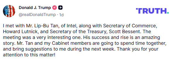 “The CEO of INTEL is highly CONFLICTED and must resign, immediately. There is no other solution to this problem,” Trump wrote on his Truth Social platform.